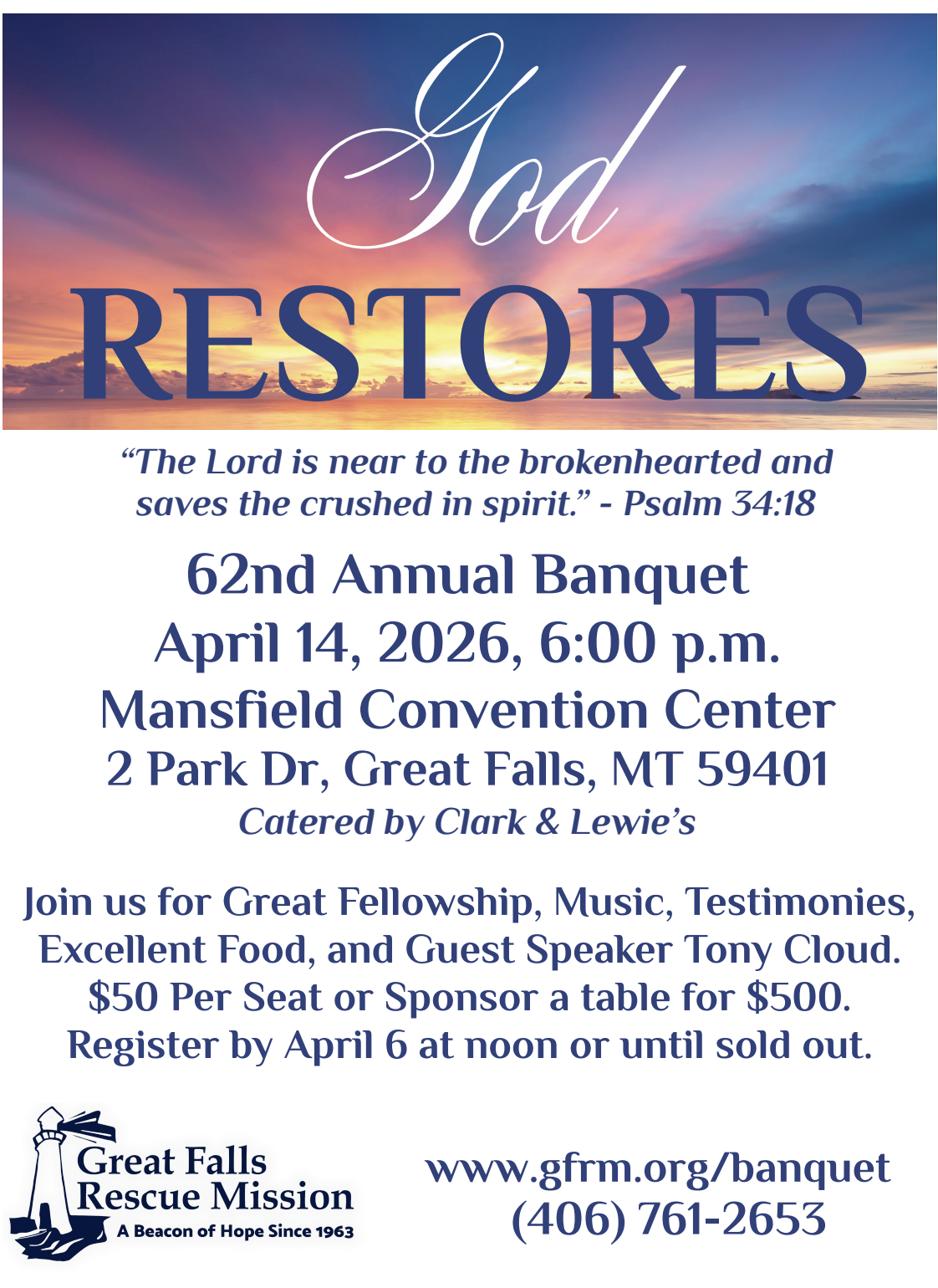 It’s that time of year again! You are invited to join us for our 62nd Annual Banquet on Tuesday, April 14, 2026 at 6:00PM. We hope you will join us at the Mansfield Convention Center for a delicious meal in addition to hearing personal testimonies about how Great Falls Rescue Mission is impacting lives of homeless and hurting people in our community.